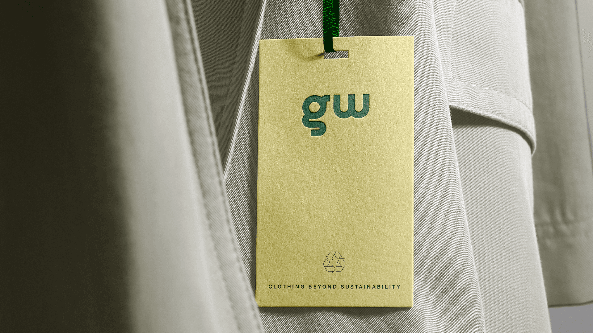 All clothing materials feature the brand's signature earthy tones and minimalist design, emphasizing simplicity and sustainability. The use of the "gw" logo on the cloth tags gives a subtle yet memorable, brand presence.