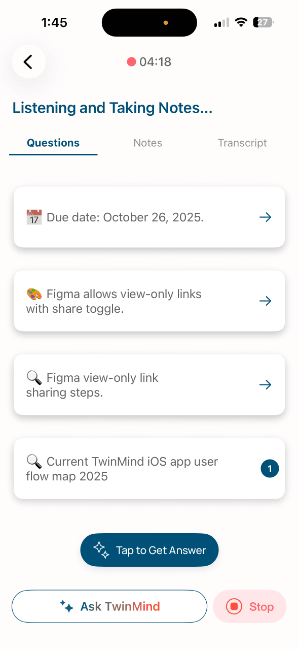 I added a bottom sheet for recording and renamed the “Notes” tab to “Summary” for clarity. Users can swipe down to close it, and “Ask TwinMind” works while recording continues in the background.